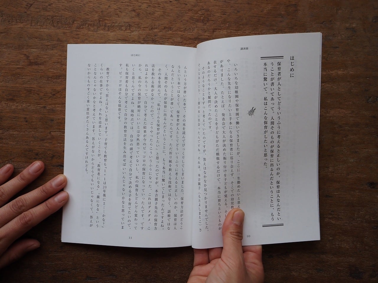 本冊子は、この講演内容をベースに、中島とともに日々の保育に携わっている保育スタッフのトークや保護者のエッセイを新たに加え、より充実した内容となっています。